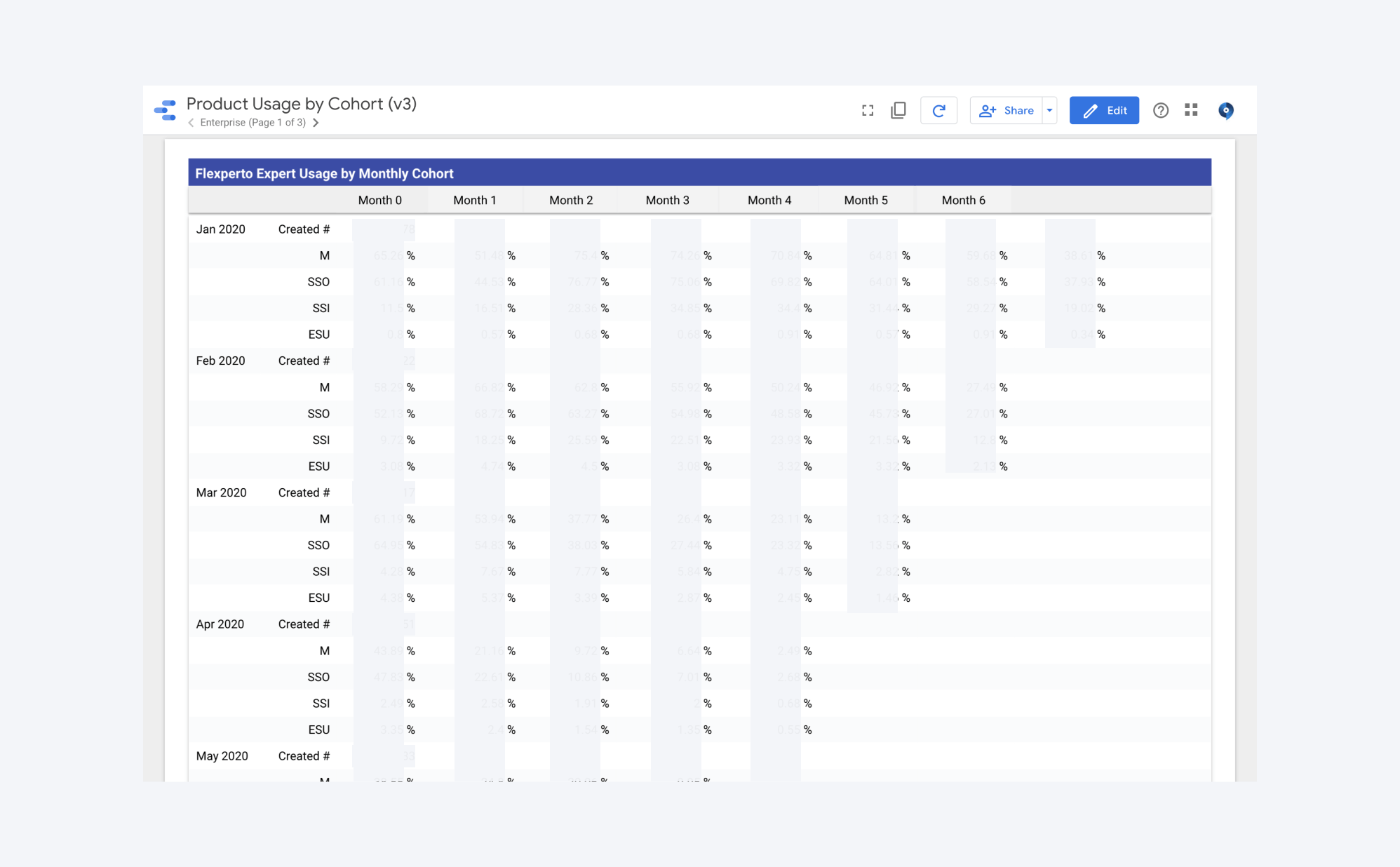 A recent cohort dashboard I built with SQL in Bigquery and visualization in Data Studio to track Flexperto's product engagement and retention.